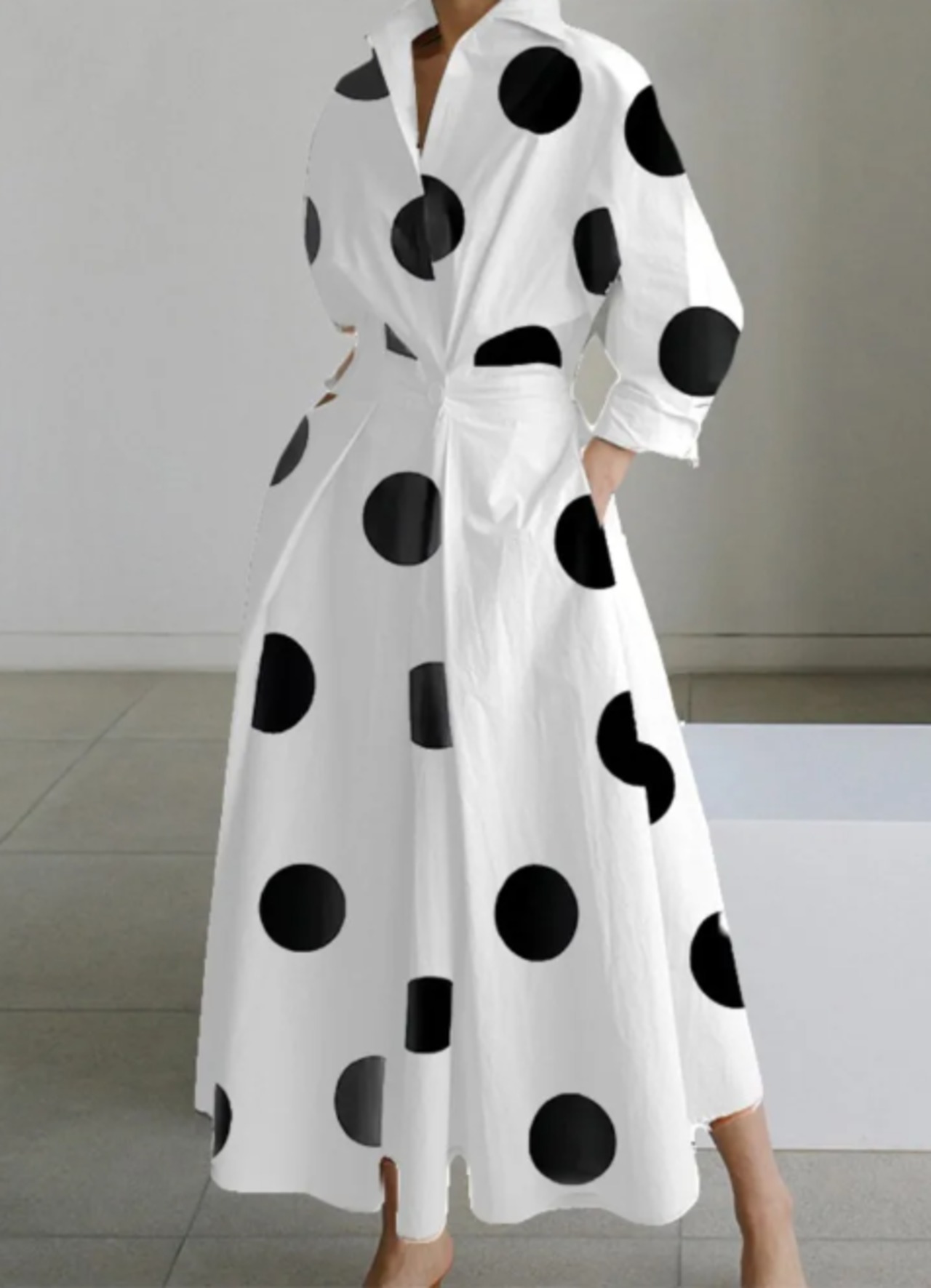 長袖 マキシドレス 水玉 模様 カジュアル Vネック シャツ イブニング ロング