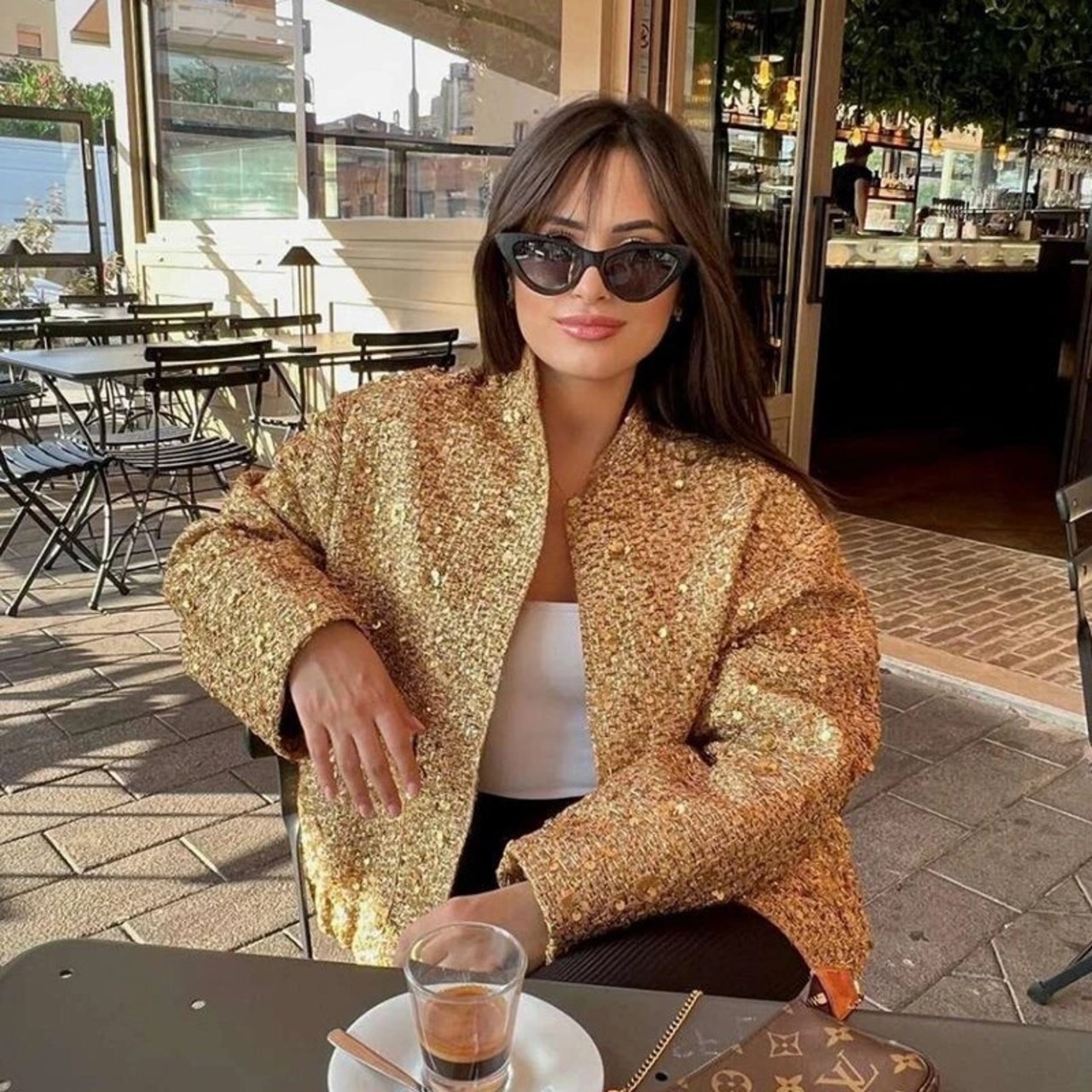 ポケット付きスパンコールジャケット 長袖 スタンドカラー ゴールドカラー トップ ファッショナブルなアウター
